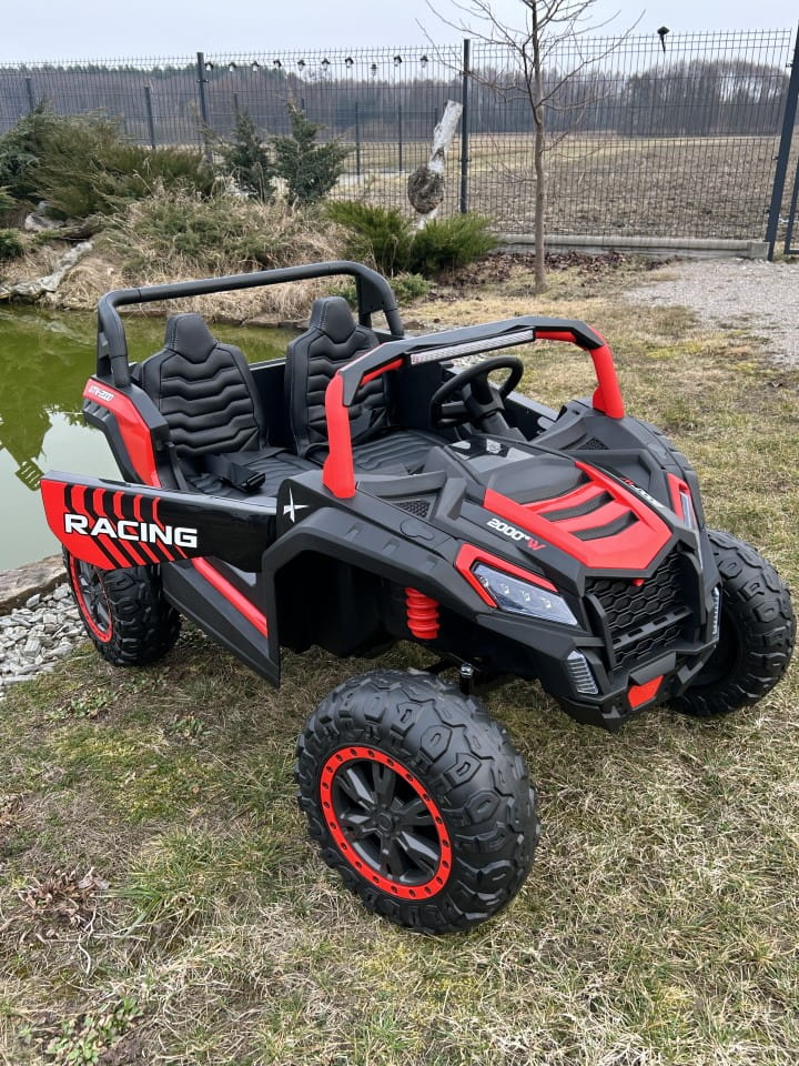 Auto na Akumulator SPECYFIKACJA: 4 napędy z silnikiem o napięciu 24V 200W każdy łącznie 800W Akumulator 24V 14Ah żywotność akumulatora około 250-300 ładowań (przy prawidłowym użytkowaniu samochodu) 2 osobowy (regulowane siedzenia) Posiada funkcję płynnego - wolnego startu (nie szarpie podczas ruszania) Z pozycji jazdy dziecka mamy 2 prędkości do przodu: około 5km/h i 9km/h + wsteczny. Przy sterowaniu z pilota mamy 3 prędkości do przodu plus wsteczny Zdalne sterowanie - pilot 2.4Ghz MHz w zestawie, sterowanie przód/tył oraz lewo/prawo. możliwość zatrzymania pojazdu z pilota Otwierane drzwi Ledowe światła IMIENNE TABLICE GRATIS - naklejki imienne stylizowane na tablice rejestracyjne gratis - po zakupie podaj nam imię dziecka KOLORYSTYKA AUTA Aukcja dotyczy koloru CZERWONY Samochód Elektryczny FUNKCJE: Panel muzyczny z kilkoma wgranymi melodiami, oraz możliwością podłączenia swoich melodii za pomocą USB , SD dźwięki w kierownicy ( różne wgrane melodie oraz klakson ) włącznik przełącznik szybki/wolny włącznik świateł przełącznik przód tył Samochód na Akumulator WYMIARY długość: 135 cm szerokość: 95 cm wysokość: 80cm Wysokość od podłoża: 21cm Odległość od końca siedziska do pedału gazu regulowana 35-41cm szerokość łączna obydwu siedzisk :61cm głębokość: 26, wysokość oparcia:31 Maksymalne obciążenie 60kg Czas jazdy około 2 godziny, w zależności od sposobu użytkowania i terenu jazdy Masa własna 38kg Czas ładowania 8-10godzin godzin nie dłużej jak 12g Auto Elektryczne dla Dzieci SKŁAD ZESTAWU: Kompletne autko Ładowarka Instrukcja Pilot Zdalnego Sterowania Spersonalizowane Tablice Rejestracyjne Samochód na Akumulator dla Dzieci Pojazd elektryczny dla dziecka Buggy napędzany jest czterema mocnymi silnikami 24V każdy o mocy 200W zasilanymi 24V 14Ah akumulatorem. Posiada wolny start- płynne ruszanie. Jest duży, bezpieczny, Łatwy w obsłudze i bardzo mocny. Spokojnie pokonuje małe nierówności Posiada wygodne siedzenia, wyposażone w pas bezpieczeństwa oraz pilot zdalnego sterowania dla rodzica, który pozwala sterować samochodem w przód i tył a także w lewo i prawo. Za pomocą pilota można również zatrzymać pojazd. DUŻE MIĘKKIE KOŁA WYKONANE ZE SPECJALNEGO TWORZYWA TYPU EVA - BARDZO MOCNE, CICHE I SUPER PRZYCZEPNE . Średnica to 36cm Szerokość 14cm AMORTYZATORY TYLNIEJ OSI SKÓRZANE FOTELE Pojazd posiada dwa oddzielne regulowane miękkie fotel z dwoma pasami bezpieczeństwa. Łączna szerokość obydwu foteli to aż 61cm. Co ważne każdy fotel jest przesuwany oddzielnie przód/tył. Dzięki temu odległość od pedału gazu do krawędzi siedziska może być 35cm lub nawet 41cm.