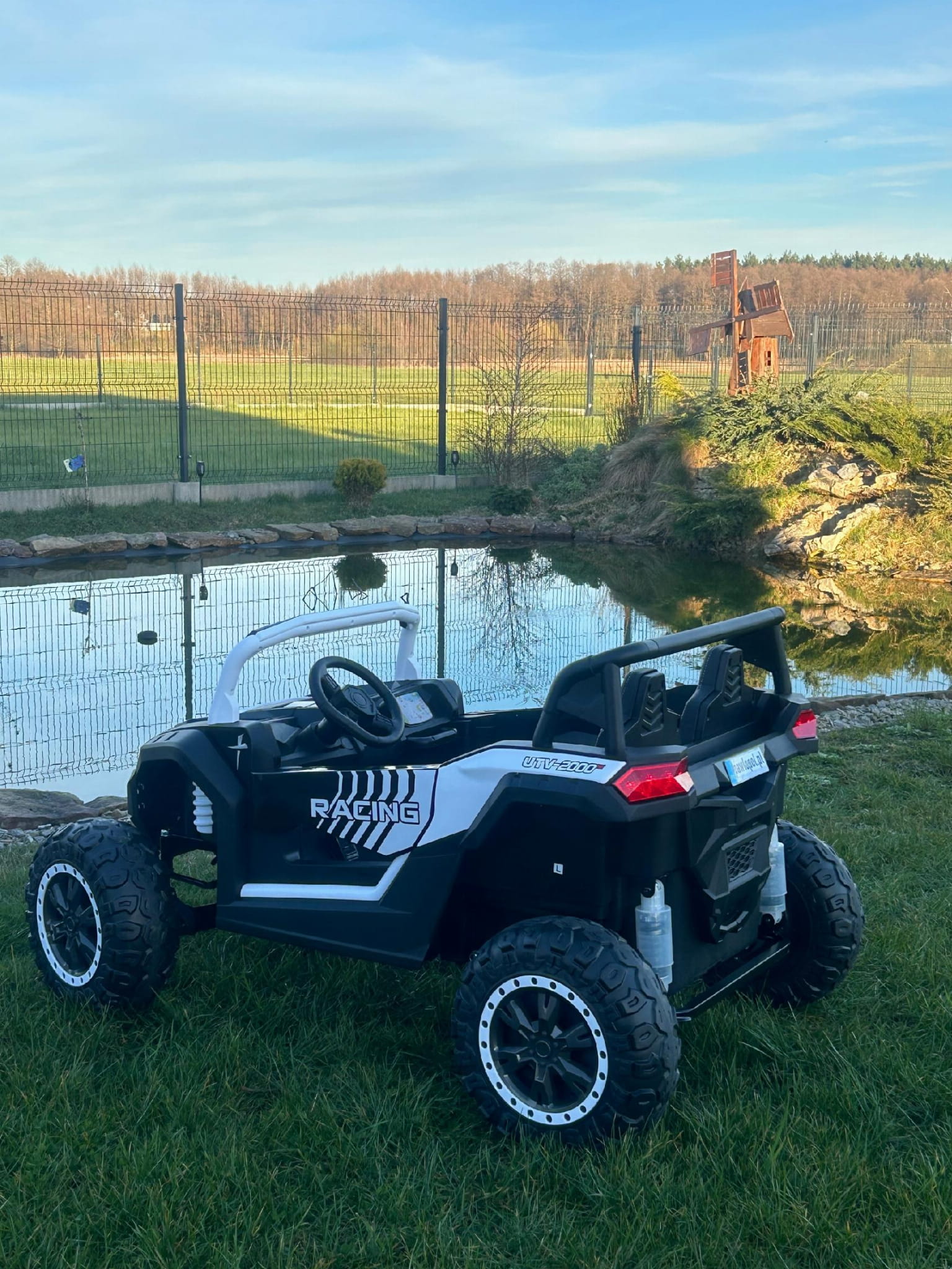 Posiada wygodne siedzenia, wyposażone w pas bezpieczeństwa oraz pilot zdalnego sterowania dla rodzica, który pozwala sterować samochodem w przód i tył a także w lewo i prawo.