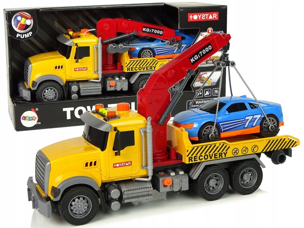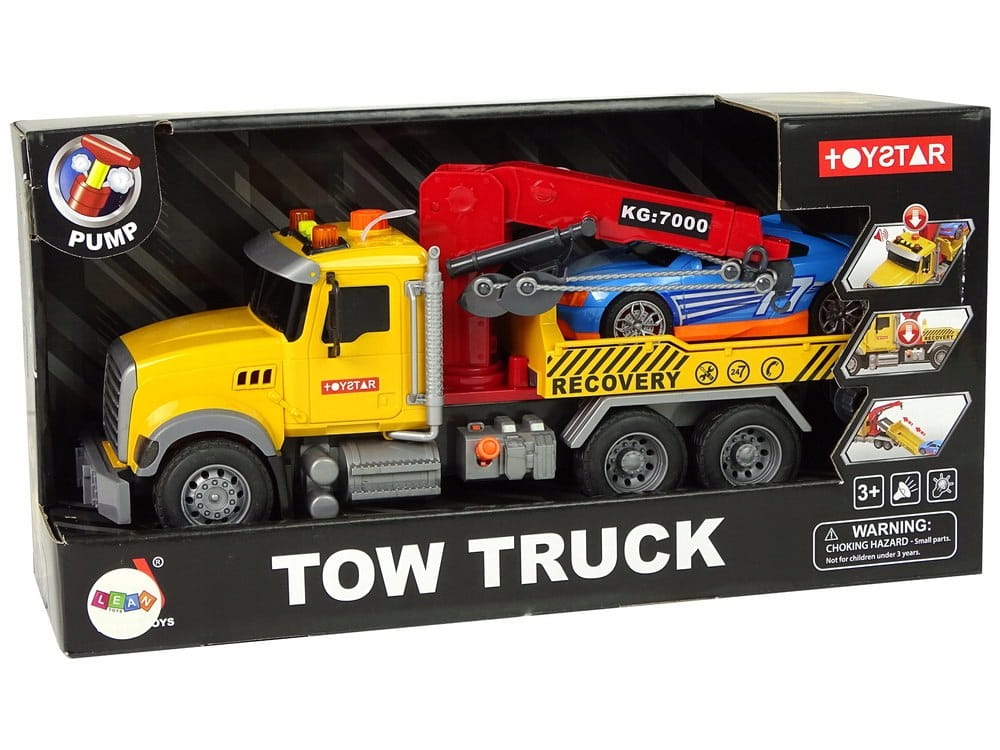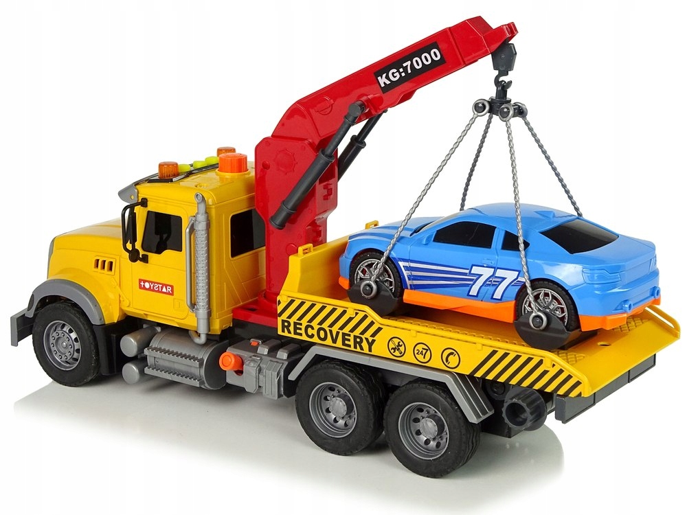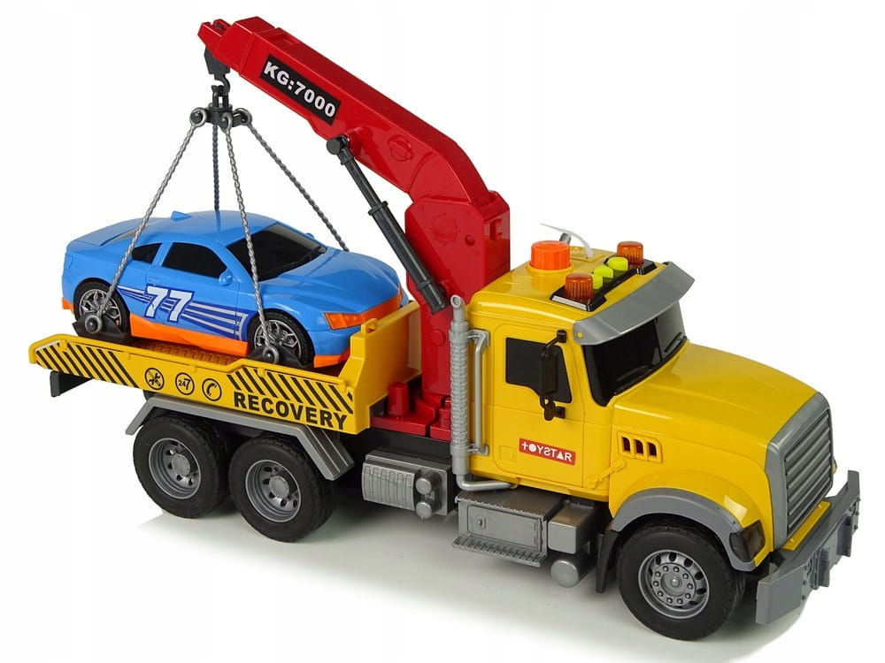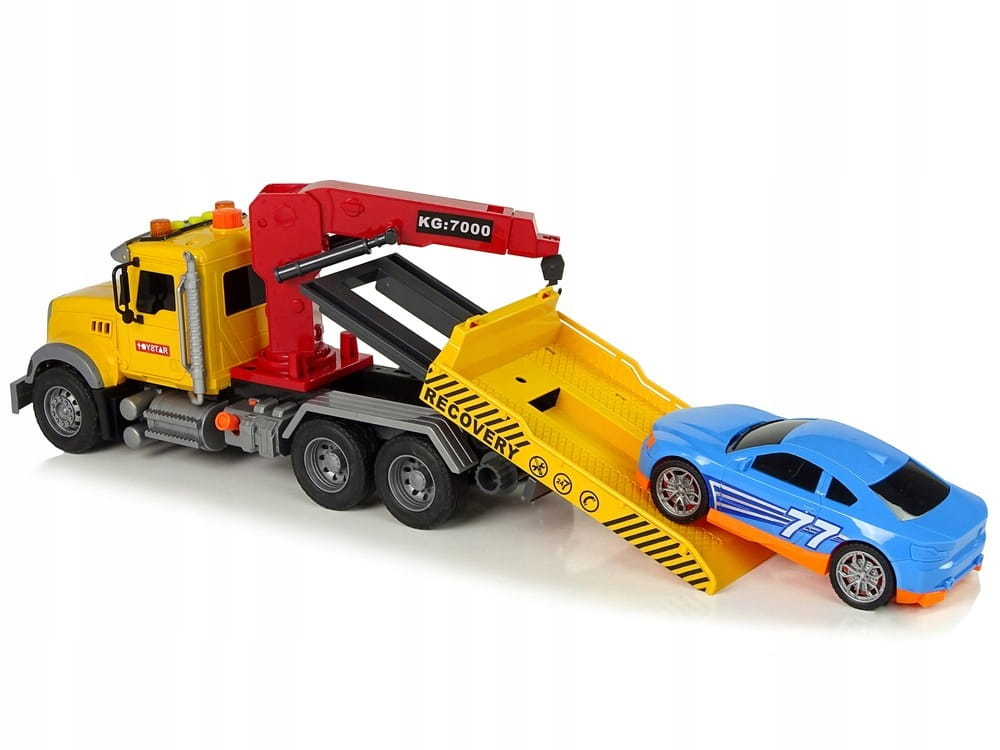 Dodatkowe funkcje jak efekty dźwiękowe i świetlne dodadzą efektu i realizmu całej zabawie. Koguty ostrzegawcze na górze informują o poruszaniu, na górze przycisku odpowiadają za dźwięki- klaksonu, wciągania autka z alarmem, cofania. Kolorystyka szaro- żółta sprawi, że z daleka autko będzie widoczne. Laweta posiada frykcyjny napęd tylnej osi na popych, wystarczy nacisnąć na tył, puścić do przodu i cieszyć się prędkością.