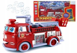 Zabawka, jakiej jeszcze nie było! Dziecięcy wóz strażacki jest interaktywny i kryje w sobie wiele niespodzianek. Autko podczas jazdy puszcza piękne, mieniące się kolorami tęczy bańki mydlane. Należy tylko wyjąć zatyczkę, wlać płyn za pomocą lejka i gotowe.