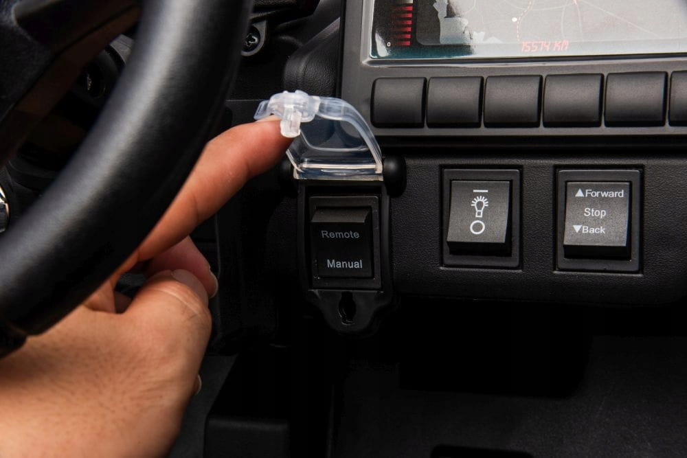 Po przełączeniu przełącznika na desce rozdzielczej na „remote”- mamy pełne sterowanie z pilota nad pojazdem dziecka. W tym momencie to my kontrolujemy pojazd za pomocą pilota - sterujemy nim w przód, w tył, w lewo, w prawo czy zmieniamy prędkość jazdy.