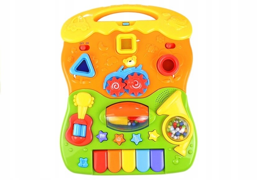 Wielokolorowy panel wypełniony jest kolorowymi światełkami i guzikami. Maluch może bawić się obracanymi grzechotkami, klawiszami i elementami na sznureczkach. Zabawka posiada włącznik i regulację głośności, pomocną między innymi przy wieczornej zabawie. Jak kreatywnie używać panelu? Na wiele sposobów! Naciskając gwiazdki, dziecko usłyszy skrzypce, trąbkę, a nawet bębenek. Naciśnięcie wszystkich gwiazdek równocześnie powoduje aktywowanie wspólnej melodii. Naciśniecie elementu znajdującego się na gitarce, uruchomi ją, a dziecko zobaczy barwne światełka - podobnie działają prawidłowo dopasowane figurki na sznureczkach. Zabawka wyposażona jest również w male pianino, na którym maluch może tworzyć własne kompozycje.