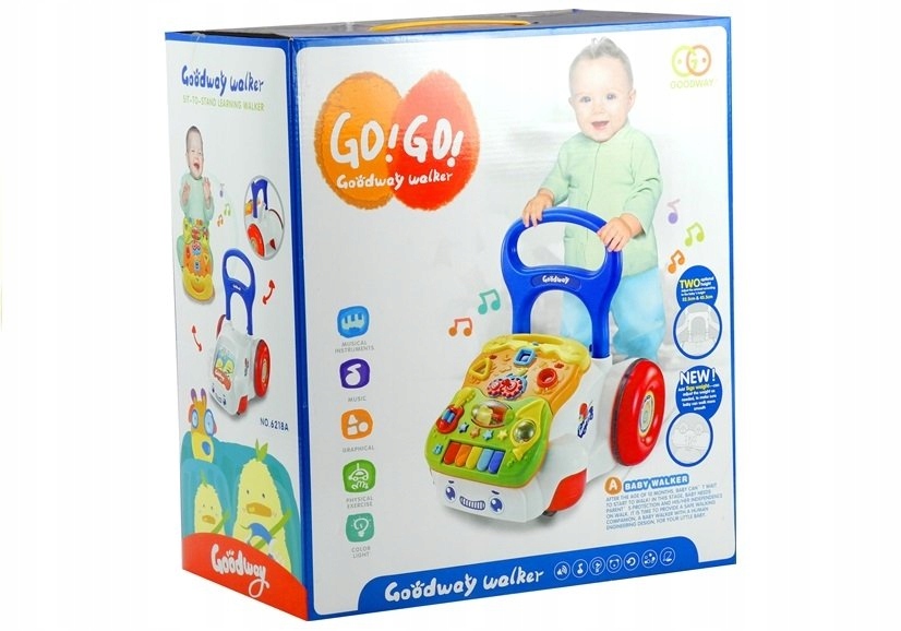 Pchacz, który polecamy dla wszystkich maluchów, pełni funkcję nie tylko pomocnika w nauce chodzenia, ale i zabawki. Chodzik zaprojektowany jest z myślą o najmłodszych dzieciakach, co jest gwarancją bezpiecznej konstrukcji i produkcji z materiałów wysokiej jakości. Spód sprzętu kryje hamulec, który możesz włączyć, jeśli chcesz by dziecko bawiło się w miejscu. Panel znajdujący się w przedniej części chodzika jest odpinany, co umożliwia zabawę bez konieczności używania reszty sprzętu. Z naszym chodzikiem zadbasz o rozwój swojego dziecka już od najmłodszych lat!