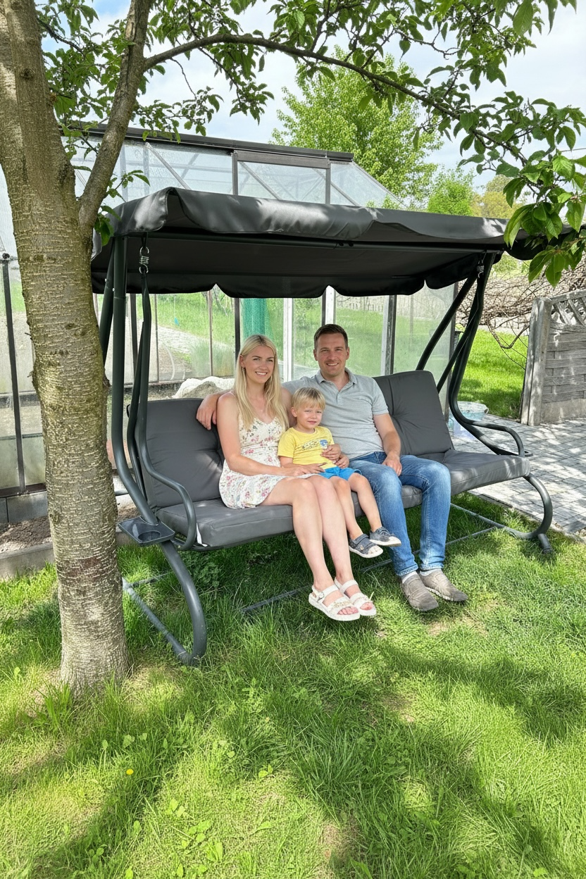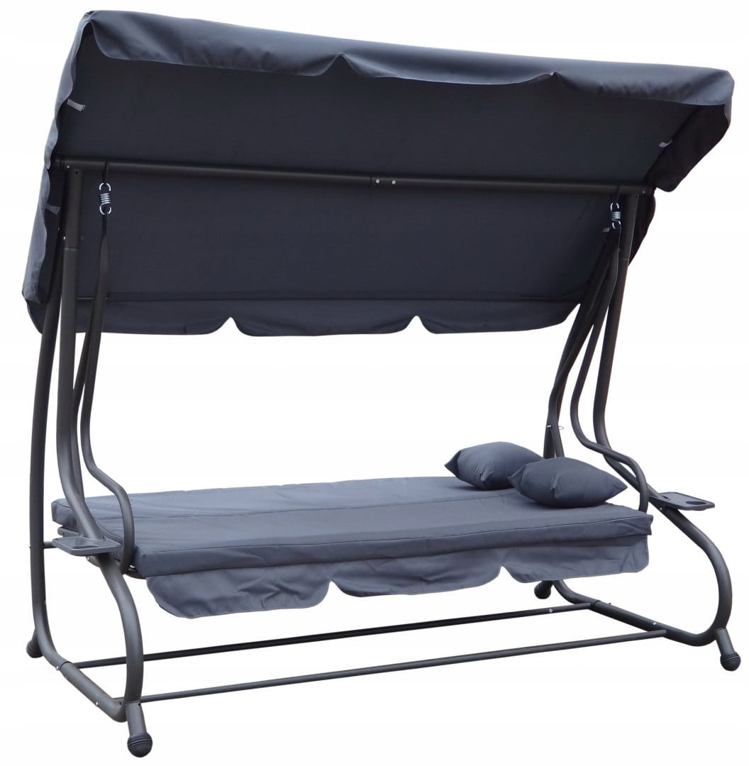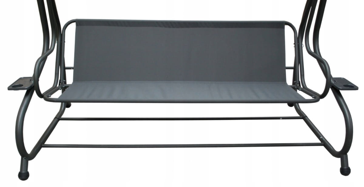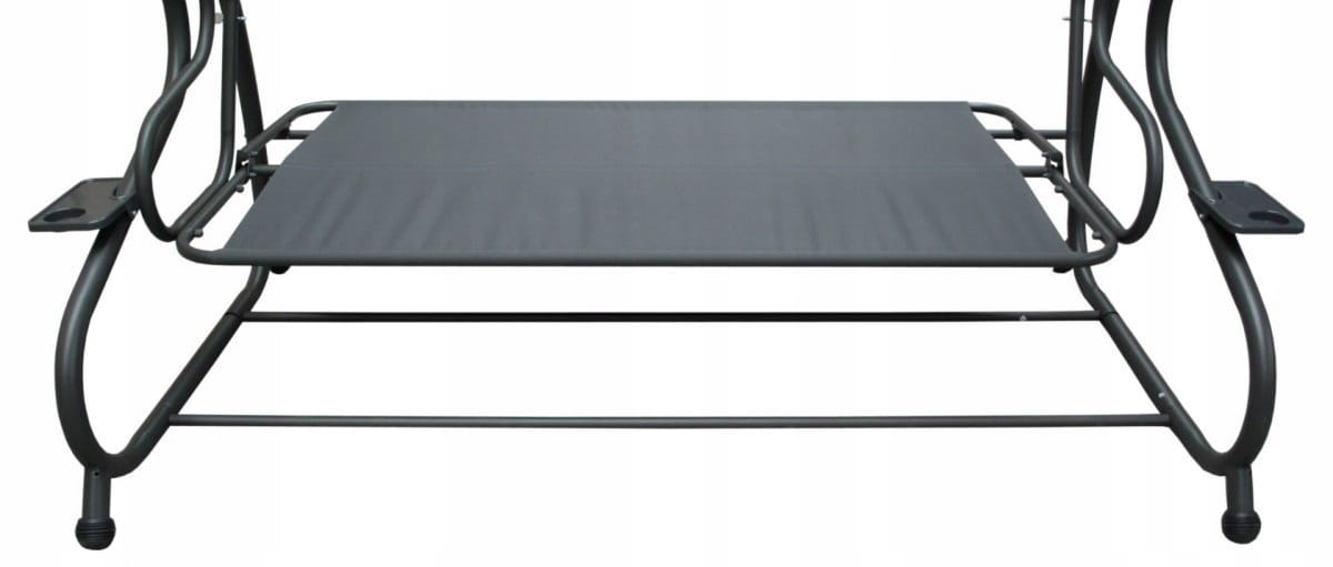 Siedzisko wykonane jest z materiału Textiline o splocie 2x1, Materiał z którego wykonana jest siatka powstaje z przędzy poliestrowej pokrytej winylem. Textiline jest przeznaczony do stosowania na zewnątrz ze względu na wysoką odporność na ciężkie warunki atmosferyczne. Siatka jest niezwykle elastyczna i odporna na rozciąganie co dodatkowo wpływa na komfort użytkowania, a sam materiał nie ulega odkształceniu. 2 poduszki oraz materac siedziska (gąbka tapicerska 10 cm), wielostopniowa płynna regulacja daszka, pokrowiec daszka wykonany z poliestru o wysokiej gramaturze 180g., rozkładane wygodne siedzisko, które może służyć zarówno do siedzenia jak i do leżenia, 2 podstawki na napoje, mocowanie huśtawki na sprężynach, konstrukcja wykonana jest ze stali malowanej proszkowo, wysokiej jakości spawy, duża odporność na działanie warunków atmosferycznych, na końcówkach nóg masywna antypoślizgowa guma, duża łatwość utrzymania w czystości, pokrowiec siedziska wykonany z poliestru o gramaturze 160g., maksymalne obciążenie 300kg. Wymiary zewnętrzne: szerokość ok. 214 cm, głębokość ok. 114 cm, wysokość daszka w części środkowej ok. 168 cm, waga ok. 39 kg, Siedzisko: wysokość oparcia bez materaca ok. 50 cm, głębokość siedziska bez materaca ok. 48 cm, 185 cm, szerokość siedziska po rozłożeniu ok. 100 cm, Daszek: długość ok. 220 cm, szerokość ok. 117 cm, Materac: długość ok. 180 cm, siedzisko ok. 48 cm, oparcie ok. 51 cm, szerokość po rozłożeniu ok. 101 cm, Opakowanie: wymiary 207 x 57 x 30 cm, waga 41 kg, Grubość rurek: ramie siedziska 32 x 1,2 mm, wzmocnienia huśtawki 25 x 0,8 mm.