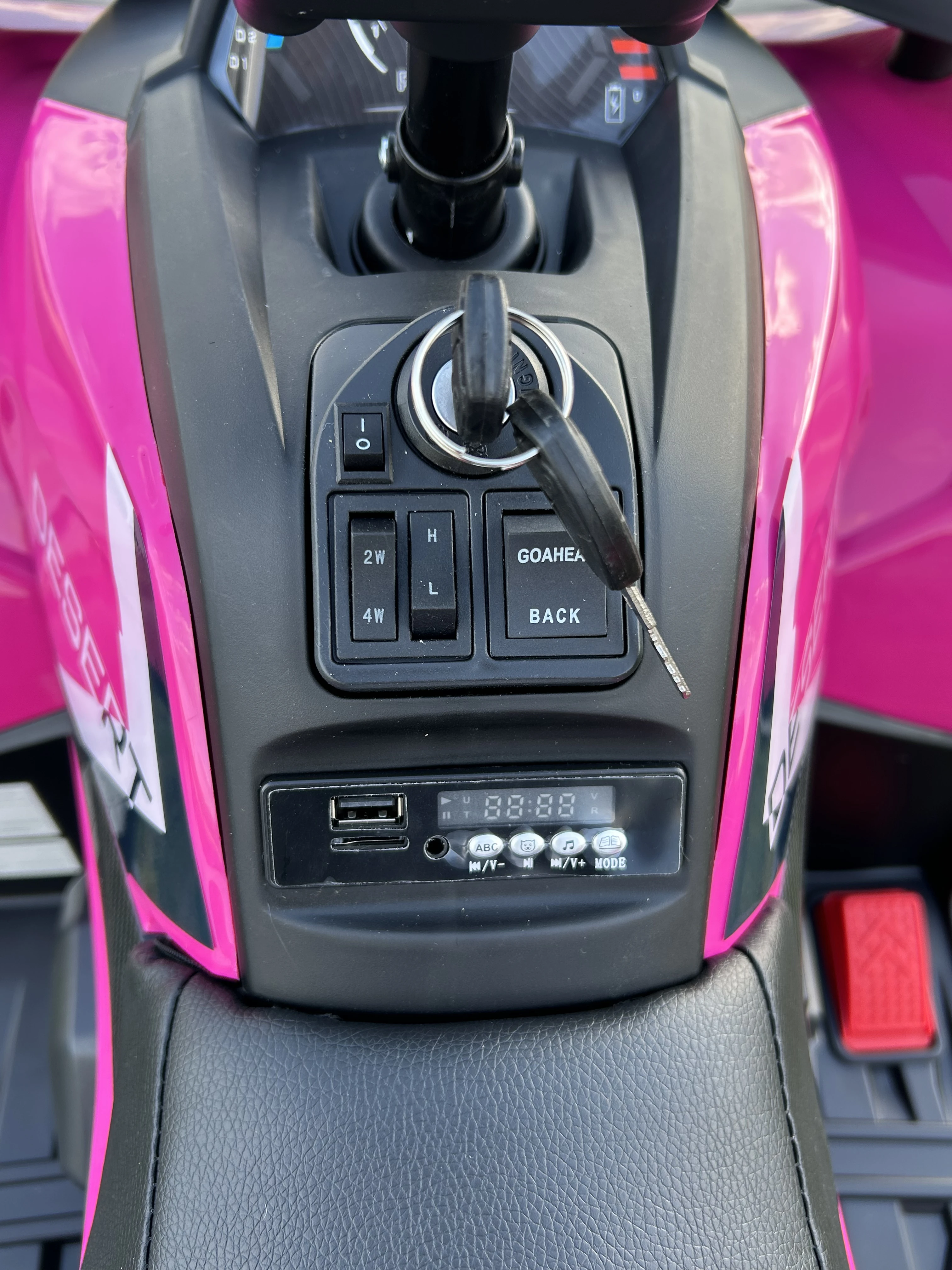 Wspólne wycieczki z naszym quadem dostarczą mnóstwo frajdy nie tylko młodemu kierowcy, ale i rodzicom. Być może taka rozrywka będzie stanowić początek pasji motoryzacyjnej, którą w przyszłości dziecko będzie dzielić z tatą? Wybierz naszego quada XMX607 i poznaj jego wszystkie atuty i możliwości. Uważamy, że wykonanie z tworzywa najwyższej jakości w połączeniu z mocną, dużą konstrukcją, zadowoli gusta najmłodszych użytkowników. Sportowy design i stylistyka wzorowane na pojazdach wyścigowych tylko zachęcą dziecko do aktywności. Decydując się na ten przedmiot, warto pamiętać, że zabawkowy quad według zaleceń producenta przeznaczony jest dla dzieci, które ukończyły 3. rok życia. Pojazd Quad ATV Desert Silniki 4x45W Napęd Zmienny napęd na 2 lub 4 koła (obsługa za pomocą przełącznika), Akumulator 12V/10Ah Pilot 2.4 GHz 3 Prędkości, Przycisk bezpieczeństwa Stop, Koła Piankowe koła EVA 35 x 15 cm, Amortyzatory 2 x przód, 2 x tył Biegi Wolny Start, 2 Przód/Tył, Światła Światła LED, Przednie/tylne, Włącznik świateł Wyposażenie: Panel Audio MP3, SD, Wgrane melodyjki, AUX, USB, Wskaźnik Naładowania Start Kluczyk, Siedzenie Czarna Wentylowana Ekoskóra, 31 x 18 cm Wymiary Rozmiar Pojazdu Długość 113 cm, Szerokość 68 cm, Wysokość 78 cm, Waga Pojazdu 22,9 Kg, Rozmiar Kartonu 102 x 64 x 53 cm, Waga Kartonu 29 Kg Maksymalne Obciążenie 50 Kg, Prześwit 21 cm, Wyposażenie Dodatkowe Instrukcja + Zestaw Montażowy, Ładowarka 1000mA, Kabel Mini Jack Specyfikacja: Liczba silników 4 Moc silnika 45W Liczba akumulatorów 1 Pojemność akumulatorów 12V/10Ah Pilot Biegi przód tył Amortyzatory przód tył Liczba miejsc 1 Materiał siedzenia ekoskóra Koła piankowe EVA Panel AUDIO MP3 wejście AUX wejście na kartę SD wejście USB Efekty dźwiękowe wgrane melodyjki Światła przód tył Przycisk bezpieczeństwa STOP Wolny START Wskaźnik naładowania Kolor różowy Wyposażenie dodatkowe kluczyk Akcesoria dodatkowe kabel MiniJack Wymiary pojazdu (ok.): Długość (cm): 113 Szerokość (cm): 68 Wysokość (cm): 78 Prześwit (cm): 21 Długość siedzenia (cm): 31 Szerokość siedzenia (cm): 18 Średnica koła (cm): 35 Grubość koła (cm): 15 Maksymalne obciążenie (kg): 50 Waga (kg): 23