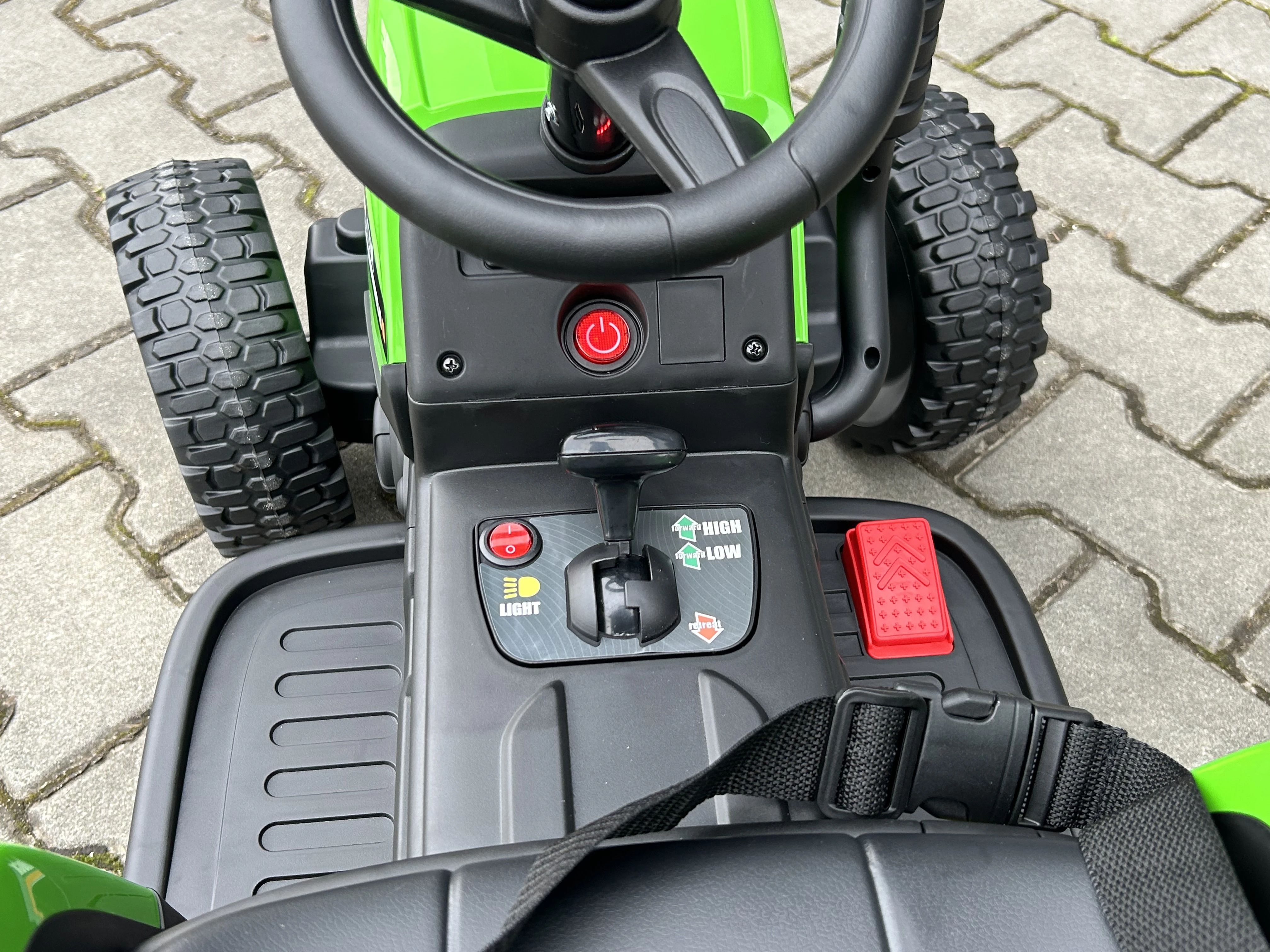Traktor napędzany jest 2 silnikami 2 x 12V 35W + 1 żelowy akumulator 12V 4,5Ah.
