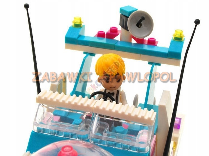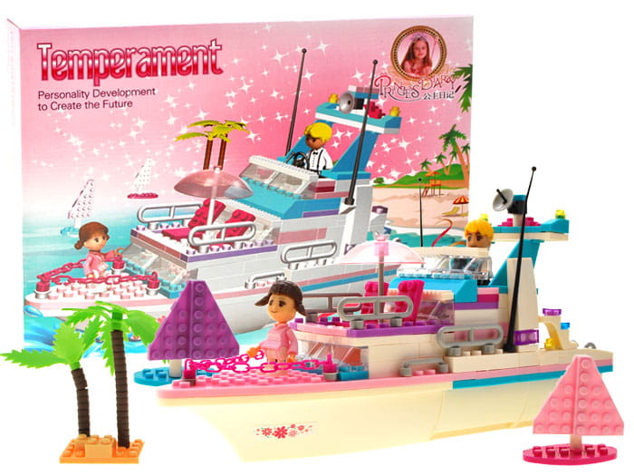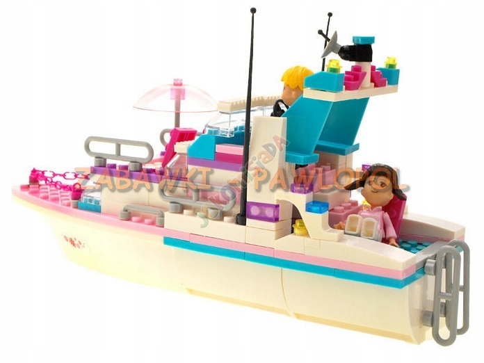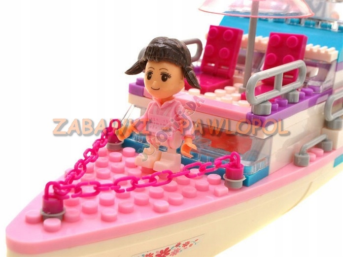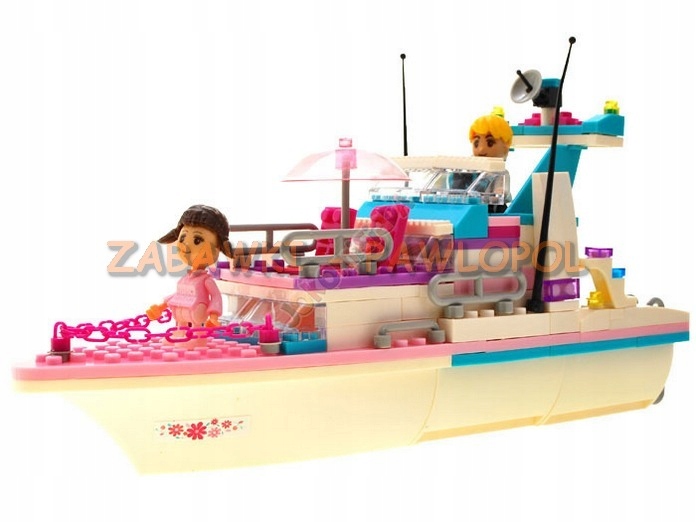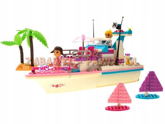 Rewelacyjne, kreatywne i mega dziewczęce klocki, z których można zbudować przecudny jacht do pływania po morzach, oceanach oraz dwie żaglówki. Jacht ma otwarty pokład i parasol p/ słoneczny. Wśród akcesoriów jest palma, figurki ludzików.