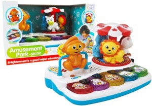 Pianinko idealnie sprawdzi się jako prezent dla dziecka. Zabawka przeznaczona dla dzieci powyżej 12 miesiąca życia. Pianinko posiada efekty świetlne i dźwiękowe. Każdy z przycisków pianinka to odgłosy zwierząt i instrumentów muzycznych. W rogu pianinka jest wesoła małpka, która obraca się wokół własnej osi. Z drugiej strony jest muzyczna karuzela ze zwierzątkami, po uruchomieniu której świecą przyciski pianina i gra wesoła melodia.