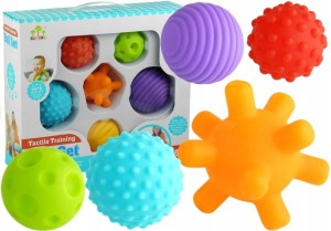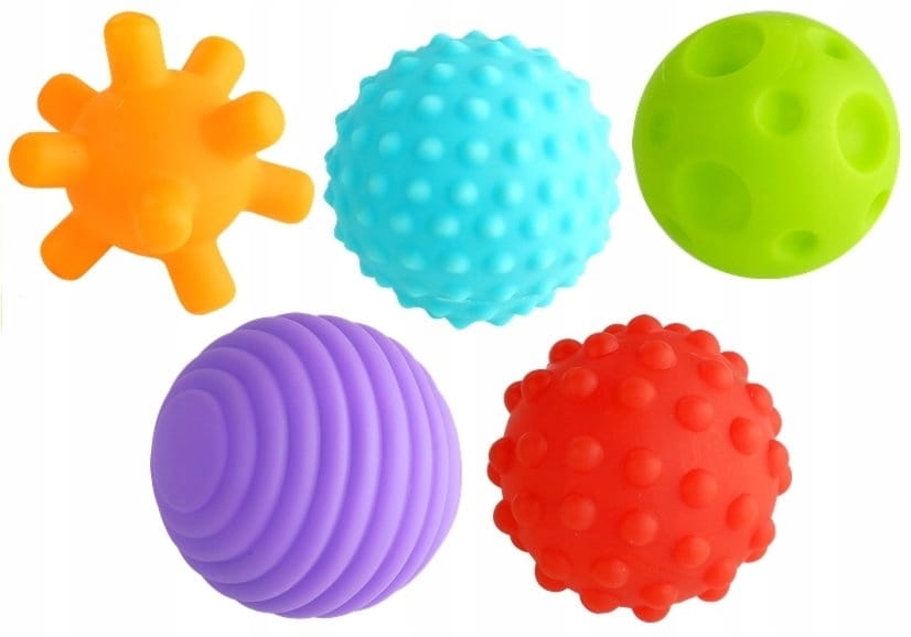 Prezentowany zestaw składa się z 6 różnych kul. Piłeczki posiadają wgłębienia i wypustki, dzięki czemu dziecko odkryje ogrom nowych wrażeń. Kształt zabawek sprzyja dodatkowej zabawie, jaką jest turlanie i rzucanie, co można połączyć z dozą aktywności fizycznej dla dziecka. Łapanie piłeczek usprawni umiejętność chwytania, natomiast kolory i ich faktury ułatwią zabawę w zapamiętywanie i odgadywanie, równocześnie rozwijając wyobraźnię.