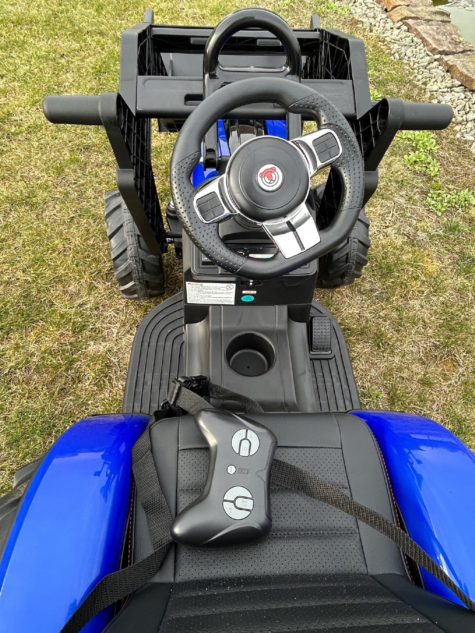 - Bezpieczeństwo: Do zestawu dołączony jest pilot zdalnego sterowania 2.4 GHz, który umożliwia rodzicowi kontrolę nad pojazdem, w tym natychmiastowe zatrzymanie przyciskiem STOP.