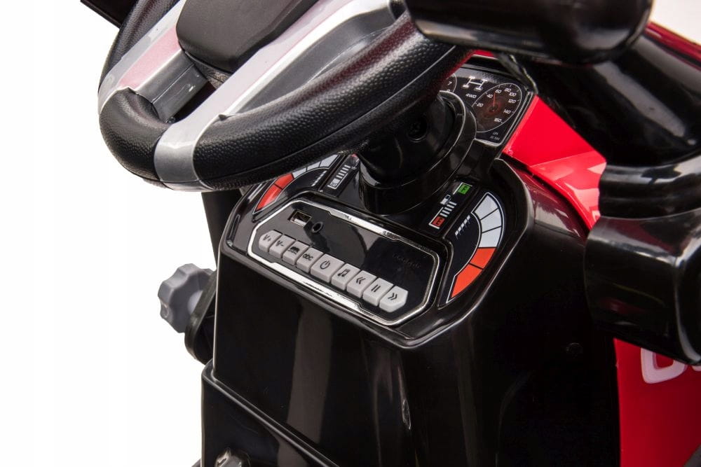 Posiada wygodne siedzenia, wyposażone w pas bezpieczeństwa oraz pilot zdalnego sterowania dla rodzica, który pozwala sterować samochodem w przód i tył a także w lewo i prawo.