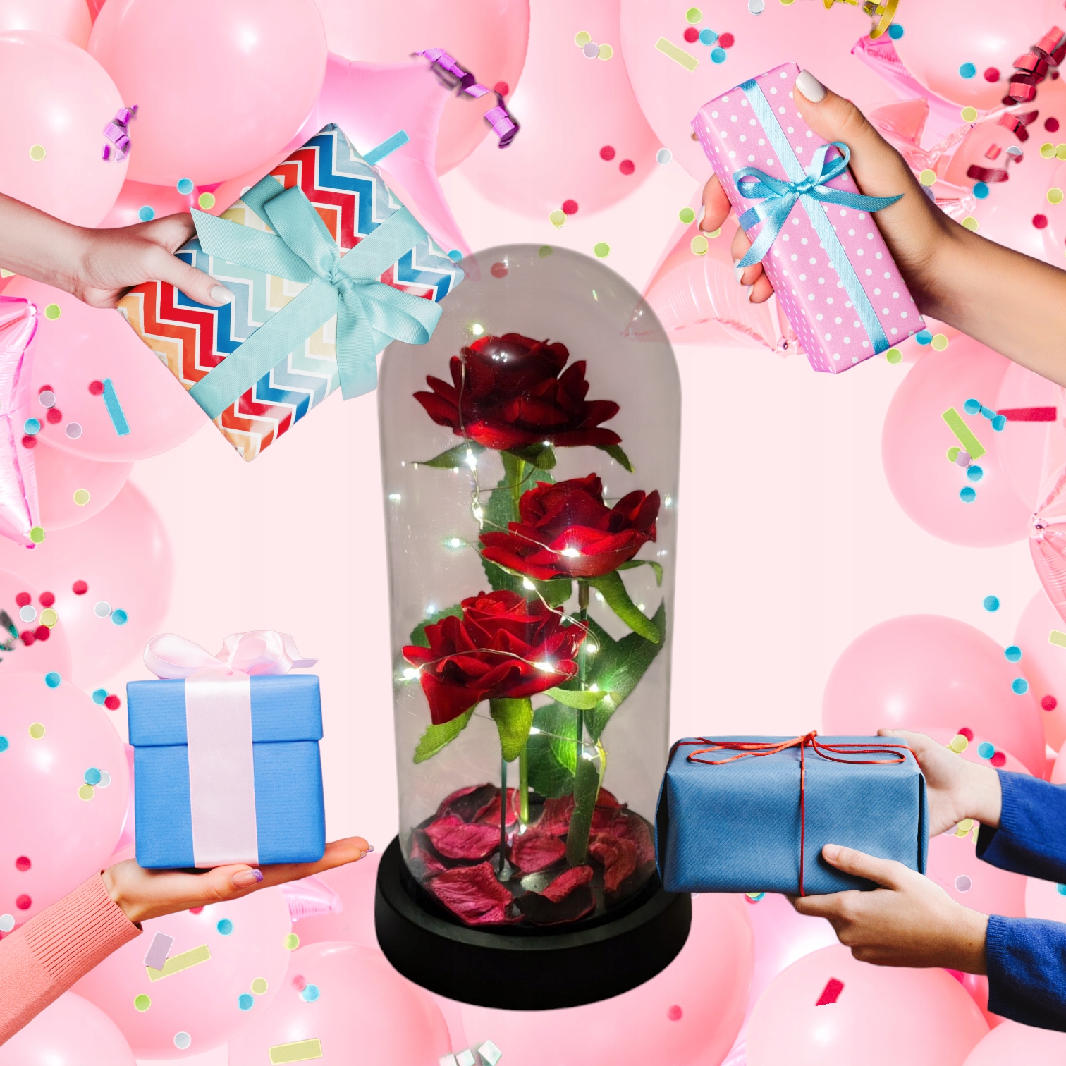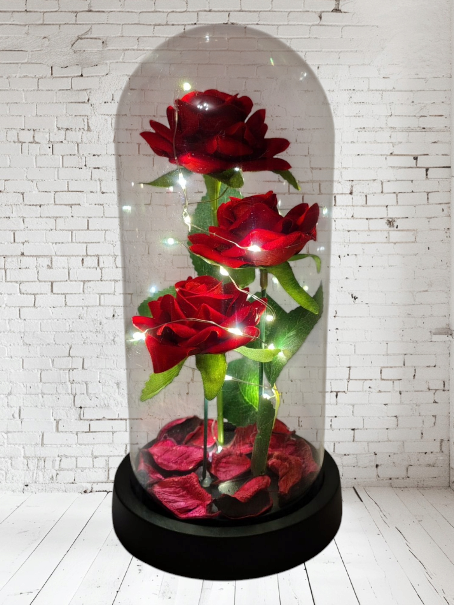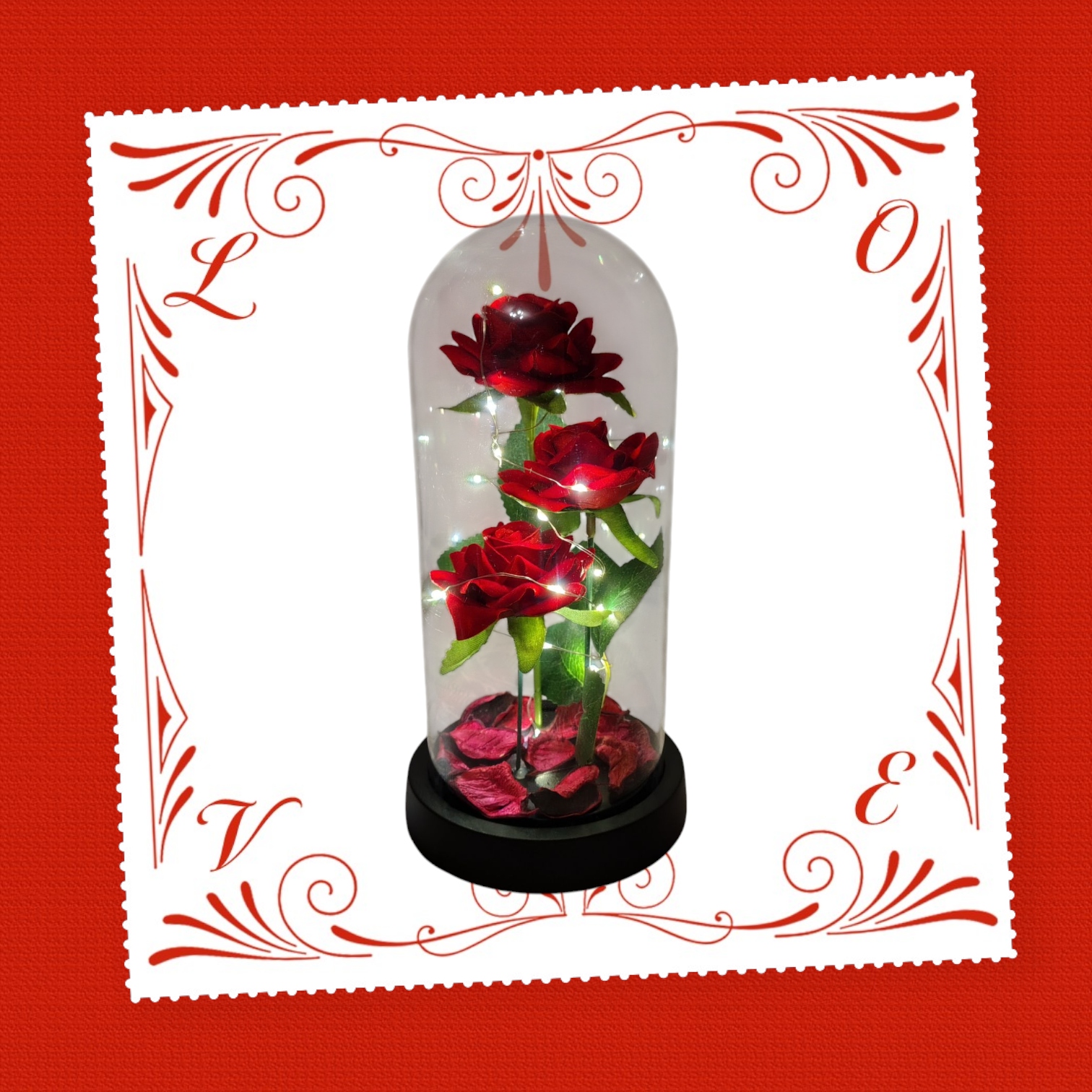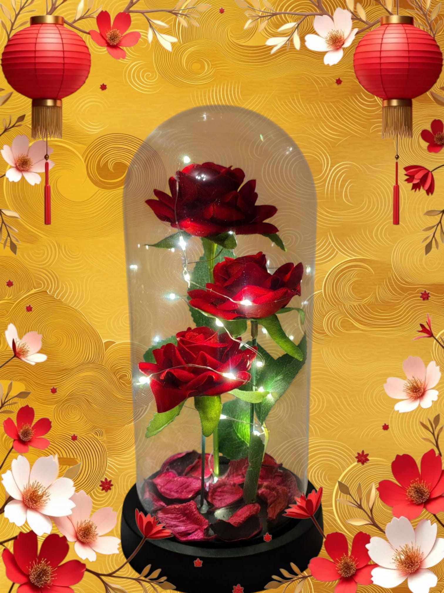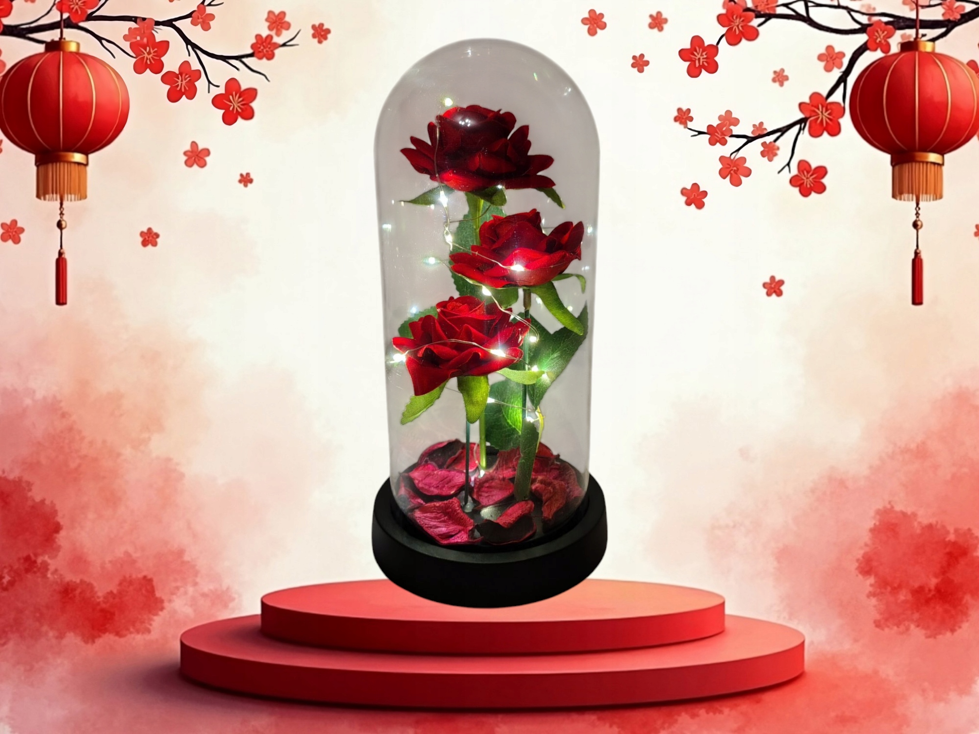 Wieczne róże w kopule z oświetleniem LED to elegancki i symboliczny prezent, który wyrazi Twoje uczucia i doda wyjątkowego charakteru każdemu wnętrzu. W kopule znajdują się trzy sztuczne róże, a w przestrzeni kopuły unoszą się płatki róż, które w połączeniu z subtelnym światłem LED tworzą niepowtarzalną atmosferę, idealną na romantyczne okazje.