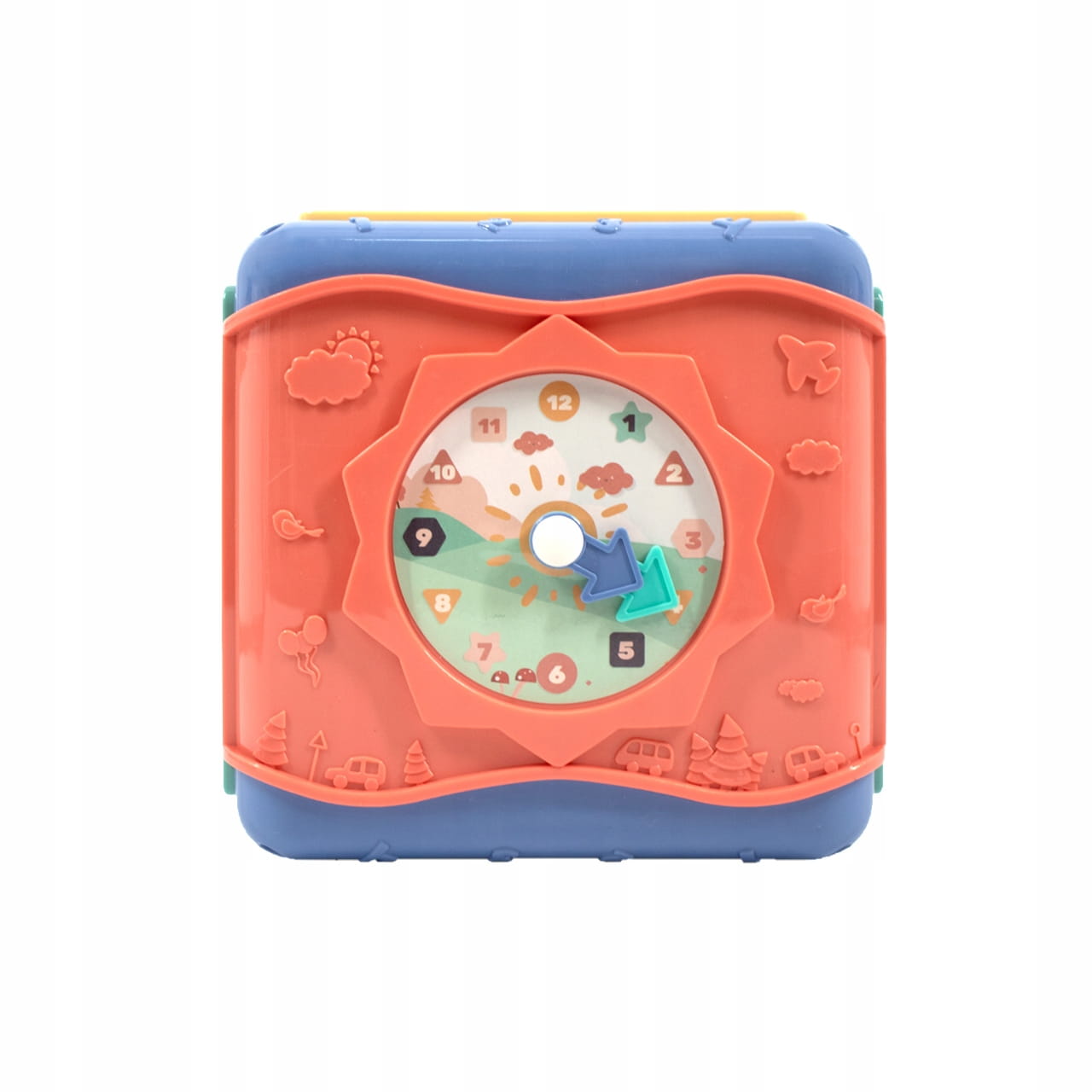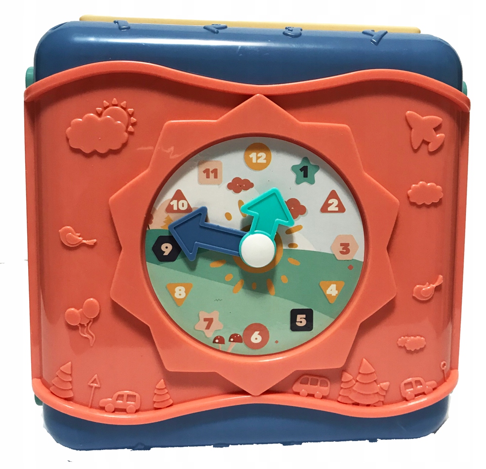 - panel z zegarem - dziecko może poznać liczby 1-12 oraz godziny, a także nabyć umiejętność odczytywania godzin z tradycyjnego zegara. Zegar posiada ruchome wskazówki.