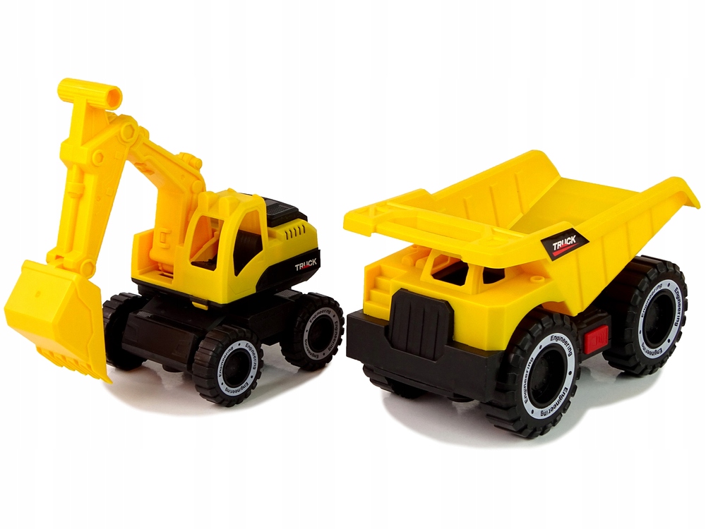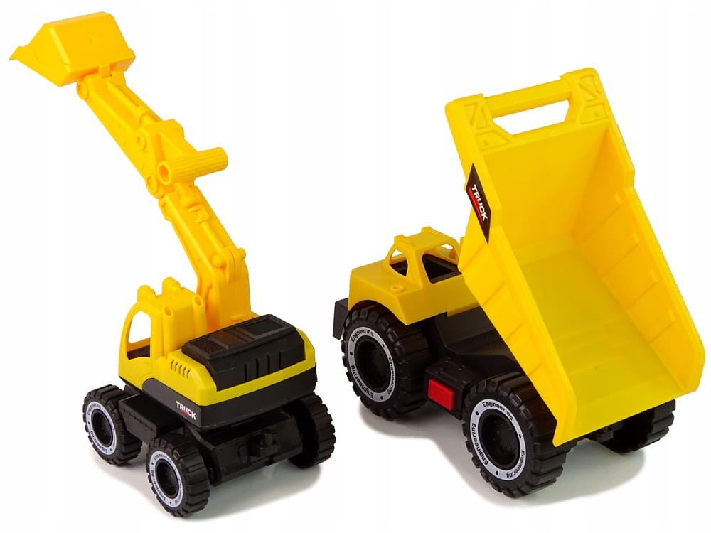Żółta wywrotka posiada ruchome koła, unoszoną naczepę, całą zawartość można wysypać w odpowiednie miejsce. Po boku wywrotki umieszczony jest przycisk, który uruchamia efekty świetlne i dźwiękowe, czyniące zabawę jeszcze lepszą frajdą! Odgłos odpalania i działającego silnika umożliwią bardziej realistyczne odczucia. Koparka również ma ruchomą łyżkę, bez problemu wykopie mały dołek w piasku.
